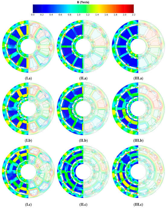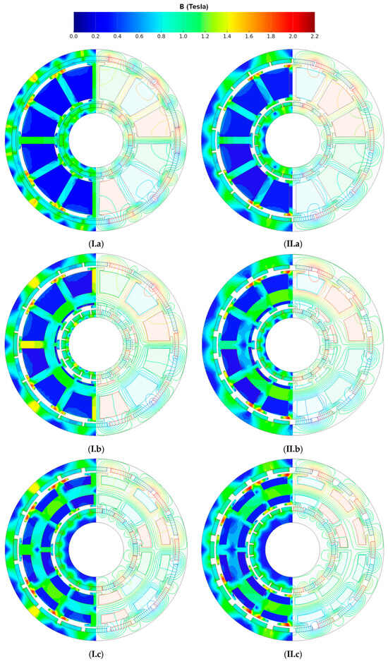 Flux density distributions and flux lines at rated load. (I). 12s10p. (II). 12s20p. (III). 12s22p. (a) TC-SDRPM. (b) TC-PDRPM. (c) TW-PDRPM.