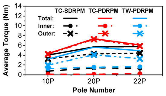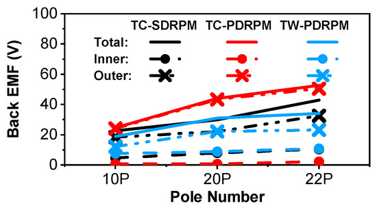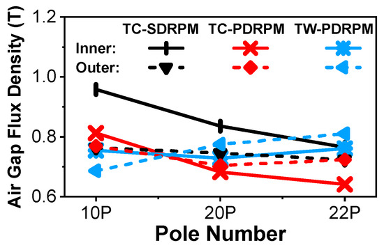 Figure 16 shows the variations in the inner and outer air gap flux densities of all machines with pole numbers. In the TC-SDRPM machine, the interaction between inner and outer fluxes decreases the outer air gap flux density, as the inner air gap flux density decreases with the pole number. As mentioned in Section 4, the inner rotor contributes minimally to the TC-PDRPM machine. Therefore, the TC-PDRPM machine exhibits the lowest inner air gap flux density.