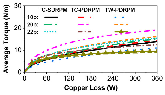 Average torques versus copper loss of TC-SDRPM, TC-, and TW-PDRPM machines with different slot/pole number combinations with zero d axis current.