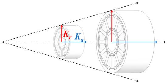 According to [23], the IS PDRPM machine outperforms the IS SDRPM machine in megawatt (MW) wind power generation applications. However, different machine sizes with different slot/pole number combinations should be discussed for different applications. Therefore, this section investigates the influence of the machine size for TC-SDRPM and TC- and TW-PDRPM machines with different slot/pole number combinations. The scaling-up analysis is conducted in three distinct directions, as illustrated in Figure 25. The red arrow Kr presents the machine only scaling up in the radial direction but keeping other parameters the same in the axial direction. The blue arrow Ka shows the machine only scaling up in the axial direction but keeping other parameters the same in the radial direction.