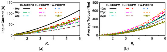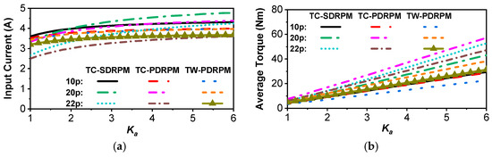 Therefore, the input currents in the TC-SDRPM and TC-PDRPM machines increase more with Ka than in the TW-PDRPM machines. A more significant increase in the torque of the TC-SDRPM and TC-PDRPM machines can be observed compared to the TW-PDRPM machines.