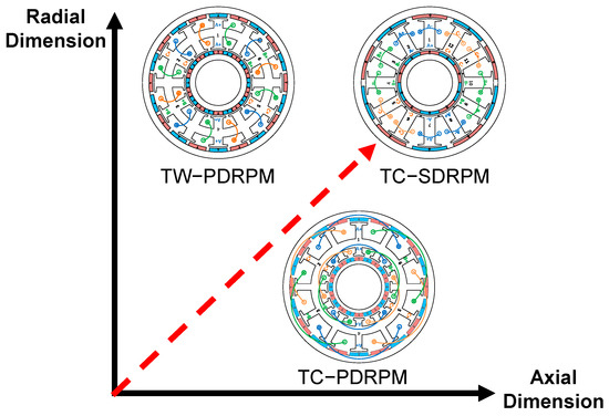 The TC-SDRPM, TC-, and TW-PDRPM machines with different slot/pole number combinations and machine sizes are discussed in this section. Figure 29 shows the recommended machine type for different machine sizes. The discussion on the applicability of the different machine types in different dimensions only considered the electromagnetic torque of the machines. It can be concluded that the TW-PDRPM machine is better for the large-radius and small-axial length application due to the short end-winding length of the TW configuration. On the other hand, the TC-PDRPM machine is suitable for large-axial length and small-radius applications due to its relatively higher torque, and the end-winding length becomes gradually negligible with the increasing axial length. The TC-SDRPM machine always performs well when both the radial and axial lengths increase.