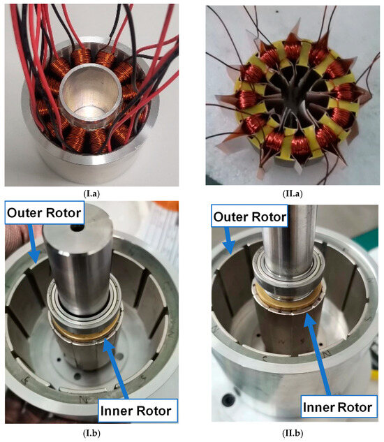 12s10p machine prototypes. (I). TC-SDRPM. (II). TW-PDRPM. (a) Stator. (b) Rotor.