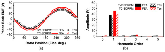 FEA predicted and measured phase back EMFs. (a) Waveforms. (b) Spectra.