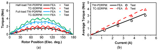 The full and half load static torques of TW-SDRPM and TC-PDRPM machines are measured by injecting a range of DC (IA = −2 IB = −2 IC = IDC), and the full load current Irated corresponds to the copper loss of 30 W, as shown in Figure 34a. Figure 34b shows the variation in the average torque with current. The measured torques match well with the FEA results, and as expected, the TC-SDRPM machine has a higher torque compared to the TC-SDRPM machine.