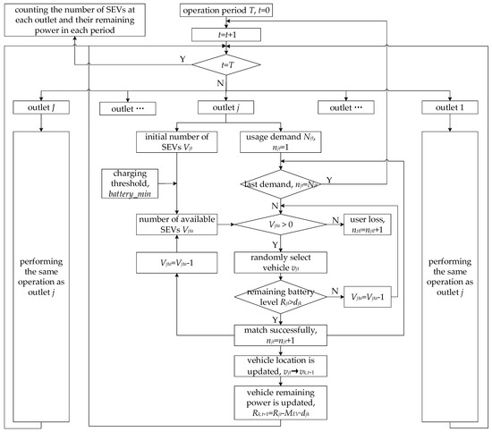There are two position states of vehicles in the SEV system: in the outlet or out of the outlet. In each period, the available vehicles in each outlet are randomly matched to the travel users. The vehicle successfully matched in the outlet will arrive at the destination outlet with the user, and the position of the vehicle will be updated. Judging the position of all vehicles in turn, the position status of each vehicle can be stored;