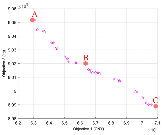Based on the setting of parameters for the SEV outlet locating model (see Table 1), a total of 60 optimal SEV outlet locating solutions are obtained, as depicted in Figure 2. From Figure 2, it is evident that the SEV outlet locating solutions considering carbon emission reduction cannot simultaneously meet the requirement of minimizing all objective values. Therefore, for all the derived outlet locating solutions, there is no distinction in superiority or inferiority; the trend of the model’s objective function values is one of trade-offs.