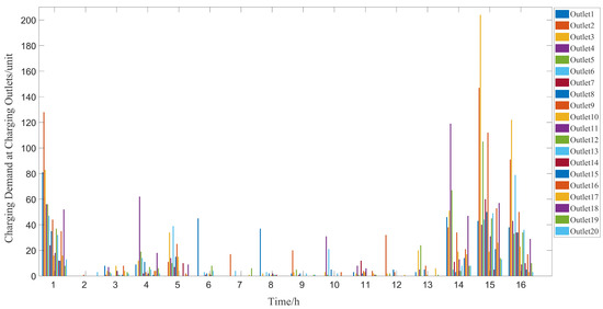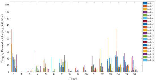 The time distribution of charging demand at each outlet in the scenarios with or without scheduling is illustrated in Figure 3 and Figure 4, respectively. As can be seen from Figure 3 and Figure 4, without scheduling in the SEV system, the distribution of charging demand at each outlet is extremely uneven, mainly concentrated during time periods 1, 14, 15, and 16, reaching a maximum of 204 units in period 15. Scheduling leads to a more even distribution of charging demand at each outlet and reduces the maximum charging demand at outlets to 129 units, representing a reduction of approximately 36.8%.
