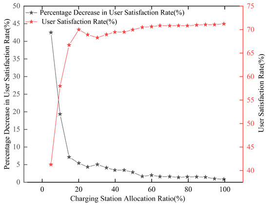 In the scenario without scheduling, the average utilization rate of the deployed 717 charging piles is 32%, with a user satisfaction rate of 70%. In the scenario with scheduling, the average utilization rate of the deployed 545 charging piles increases to 37%, and the user satisfaction rate increases to 76%. Consequently, scheduling not only reduces the total number of deployed charging piles by approximately 24.0%, but also enhances the average utilization rate of charging piles across all outlets by approximately 15.6% and the user satisfaction rate by about 8.6%.