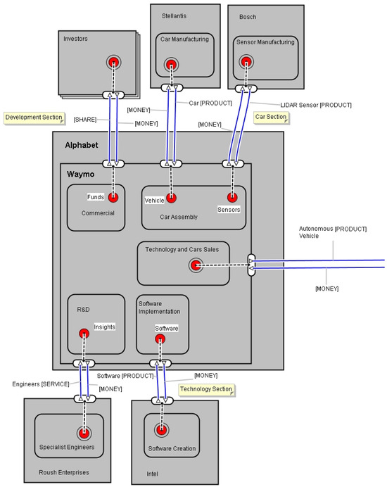 The central actor, Waymo, exchanges value with four other different actors. Waymo’s self-driving technology needs to be able to observe and recognise its surroundings to assist it in safely navigating through the hazards of the road. Waymo has been developing its technology, called Waymo Driver, that uses cameras and sensors to gather all the input from the surroundings and uses special software that processes all that information so it can tell the car what to do [6]. Waymo has been working closely with Roush Enterprises, a diversified engineering, manufacturing, and product development company specialising in automotive, aerospace, and advanced technologies, known for its expertise in performance engineering and innovation in the autonomous car sector. Intel, a major partner of several companies within the group, has been developing custom software for Waymo since the launch of Google’s self-driving car. As Waymo’s self-driving technology continues to advance, its high-performance hardware and software will demand increasingly powerful and efficient computing. Through close collaboration with Waymo, Intel delivers the advanced processing power needed to support Level 4 and Level 5 autonomy in Waymo’s vehicle fleet. As mentioned before, Waymo has partnered with the manufacturer of the Chrysler Pacifica, Stellantis [20]. One of Waymo’s key advantages lies in its in-house development and manufacturing of sensors and LiDAR systems integrated into its vehicles. This capability is a major factor in Waymo being considered one of the leading companies in autonomous driving. Although these sensors are highly complex and expensive, they offer significant improvements over the cameras and sensors that make up Tesla’s self-driving system, as noted by [21]. As mentioned, a close partnership with Bosch helps Waymo to build all these important hardware pieces peripherally to the standard Pacifica. From a market segment perspective, Waymo engages in value exchanges with investors who provide essential funding and investment. One of Waymo’s key investor partners is Magna International [22], a leading Canadian multinational specialising in the design, manufacturing, and assembly of automotive systems, components, and modules for major automakers worldwide. In addition to its role as one of the largest global automotive parts’ suppliers, Magna also makes strategic investments in innovative technologies, including electric vehicles, autonomous driving, and mobility solutions, to support future growth and maintain its leadership in the evolving automotive industry, especially in Waymo. In addition to Magna, other investment groups, including Alphabet, for obvious reasons, contribute to funding Waymo’s technological developments. In return for these investments, Waymo issues company shares, creating the value transition previously discussed in the e3value model.