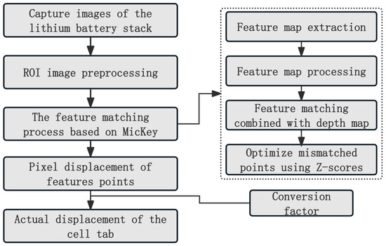 Therefore, analogous to the deformation monitoring of floor structures and bridge structures, a similar approach can be adopted for the process of multi-cell stacking pre-tensioning. To address the challenges of detecting the displacement of multi-layer cells during the assembly of lithium batteries under complex working conditions, this paper proposes a novel method for cell displacement detection based on the MicKey method, which eliminates the need for special markers. First, the region of interest (ROI) of the tab is identified using an adaptive cell boundary segmentation approach based on the HSV color space. Next, the MicKey method’s neural network keypoint matching process is employed to predict the coordinates of corresponding keypoints in the 3D camera space, reconstruct the 3D target object from 2D images, and extract and match feature point pairs. Finally, the Z-Score method is applied to filter out outlier mismatched points, enabling the calculation of accurate pixel displacements. These pixel displacements are then used to determine the precise displacement of tabs at each cell level during the assembly process. This method is integrated into a comprehensive health management system for lithium battery production, and its performance has been evaluated through a series of laboratory and field tests. The results demonstrate its effectiveness and practicality in accurately detecting multi-layer cell displacements during assembly.