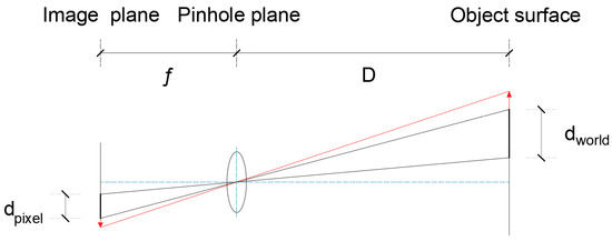 Figure 7. The red lines represent the displacement of the object as well as the corresponding displacement on the image plane, while the blue line denotes the optical axis of the lens. After the field equipment is calibrated using a spirit level, the camera’s imaging plane is aligned to be parallel to the surface of the object being measured, ensuring that the angle between the camera plane and the target surface is approximately 0°. The conversion factor (CF) is then determined by calculating the ratio of the known physical dimensions of the target surface to its corresponding pixel dimensions, as expressed in Equation (5).