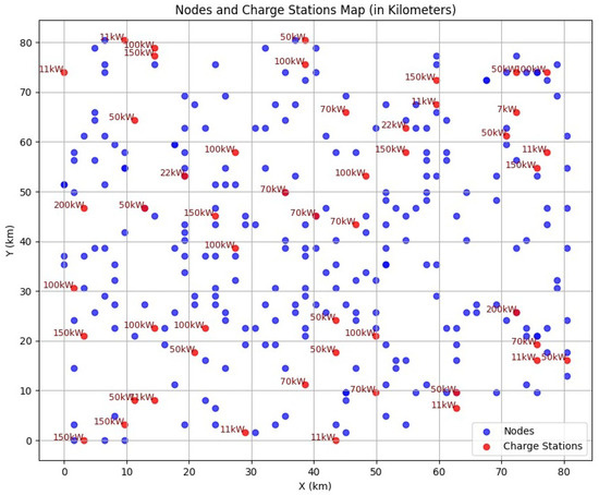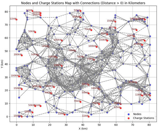 In this study, we explore EV travel in Saudi Arabia, where no charging stations currently exist, by simulating a 80 × 80 km grid representing a segment of the country’s geography. A map illustrating the simulated road network, charging station locations, and key travel nodes is illustrated in