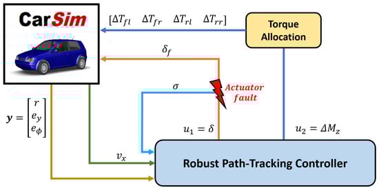 - A Multi-Input–Multi-Output (MIMO) SOF controller is developed for a path-tracking system, enabling operation in both fault-tolerant and fault-free modes. This novel approach enables the system to operate in a dual mode: under normal conditions, it relies only on the steering input actuator, and, in the event of a steering system fault, torque vectoring is activated to assist the vehicle and effectively compensate for the steering actuator faults.