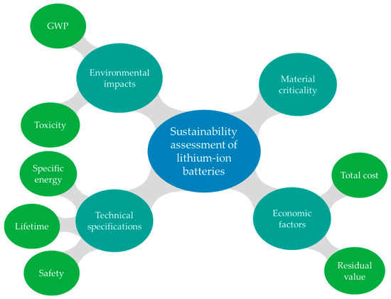 As urban areas face significant challenges due to environmental pollution and poor air quality largely driven by the transportation sector, the European Union has set ambitious targets for emissions reduction. Electrifying the transportation sector is a major area of research and innovation for mitigating these emissions. Since electric vehicles (EVs) have no direct tailpipe emissions, when charged with electricity from renewable sources, they can substantially lower the overall carbon footprint of transportation. High-capacity, efficient batteries are essential for EVs to provide sufficient range and performance, making them viable alternatives to conventional vehicles [1]. As battery costs decrease and their efficiency improves, they become key enablers of widespread electrification, helping to reduce reliance on fossil fuels and support a more sustainable energy future [2]. Assessing lithium-ion batteries (LIBs) based on sustainability criteria is crucial due to their growing role. First of all, as the demand for EVs increases, so does the need for large-scale battery production, which can severely impact the environment and lead to a scarcity of valuable resources [3,4]. In addition, when considering the expansion of LIBs, it is essential to examine technical parameters, as advancements in this field enable improved performance, efficiency, and safety. Economic factors drive affordability and scalability and should then be included to ensure a holistic assessment. By evaluating LIBs against sustainability criteria, their long-term viability can be assured, minimizing negative environmental impacts and promoting responsible production practices that support a circular economy [5].