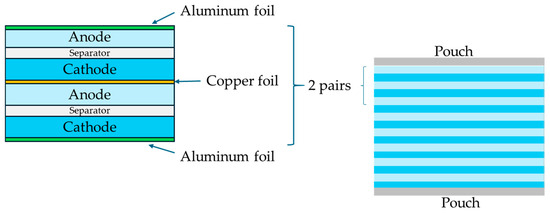 A pouch configuration was the selected format for the cells. Each cell consists of 8 pairs of cathode and anode layers, as presented in Figure 2. Graphite was considered for the anode. The data for gravimetric capacities of the cathode materials and nominal voltages are provided in Table 1. The full methodology adopted for specific energy calculation and the data used are provided in the Supplementary Materials.
