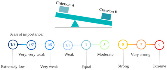 In AHP, in order to structure the decision matrix with the scores of the alternatives, all values acquired in the data collection stage were converted to a Saaty’s scale from 1 to 9, through Equation (8):
