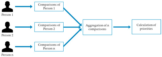 where is the importance of criterion against criterion . In matrix , the elements above the diagonal represent direct comparisons, and the elements below the diagonal are their reciprocals, ensuring consistency in the matrix [13]. The same process is followed for all the responses in the questionnaire, resulting in a number of decision matrixes equal to the number of experts. The average importance of each criterion was then calculated by applying the aggregation of individual judgments, as described in Figure 4, and using the geometric mean value , given by Equation (5):