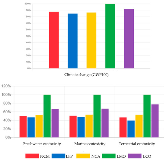 In addition, assessing the toxicity of LIBs is crucial for understanding their full environmental impact. Toxicity is primarily linked to the manufacturing processes and depends strongly on the materials used. Nickel and cobalt, in particular, lead to higher toxicity in mining, production, and EoL stages. Toxic waste may also be discharged during the manufacturing of the cathode, anode, collector, and battery management system [2,26]. The inappropriate management of EoL batteries may also lead to aquatic toxicity [27]. Understanding these toxic effects is essential for developing safer battery technologies, improving recycling processes, and formatting regulations accordingly.