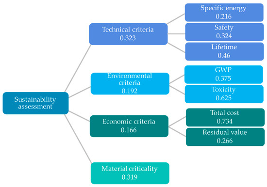 Few studies have assessed batteries for EVs following a multi-criteria approach. Loganathan et al. [14], used a weighted sum model to evaluate several alternatives based on specific power, energy density, price, reliability, and safety. Ecer et al. [15] used the Borda Count and Copeland methods to rank different EVs, incorporating criteria linked to the performance of the battery. Battery capacity, full charge time, and quick charge time were considered in their study. Liaqat et al. [16] evaluated energy storage technologies for EVs. The evaluation was based on different criteria that included costs, technical properties, compatibility, technological maturity, environment, health, and safety. These criteria and their sub-criteria were used to create an AHP model. In their work, the alternatives included different battery types (LIBs, lead acid, vanadium redox flow, sodium–nickel chloride, nickel metal hydride, lithium–sulfur, nickel–cadmium), supercapacitors, hydrogen fuel cell storage, flywheel storage, and superconducting magnetic energy storage. Tajik et al. [13] developed a hybrid MCDA method based on subjective, objective, and combined weighting methods, including Simple Additive Weighting, Criterion Impact Loss, the Technique for Order Preference by Similarity to Ideal Solution, the Measurement of Alternatives and Ranking according to Compromise Solution, Additive Ratio Assessment, and the Combined Compromise Solution to assess different cathode materials for LIBs. The cathode materials assessed were LCO, lithium nickel oxide, NCA, NCM, LMO, and LFP. The performance of the alternatives was evaluated through the Final Ranking of Alternatives and the Copeland method. The Data Envelopment Analysis model was used in their study to evaluate the performance of the different cathode materials. The alternatives were assessed against nine criteria: cell voltage, power, energy density, safety, lifetime, discharge capacity, stability, cost, and toxic components. Baars et al. [17] proposed an integrated model and framework to assess the environmental, technical, and socio-economic aspects of LIBs for EVs. The methodology was used to calculate how material design strategies can potentially improve the cost, carbon footprint, material criticality, and energy density of the batteries. In their study, Multi-Objective Optimization was the proposed method to solve the model. Niu et al. [10] conducted a comprehensive evaluation of different EVs from a consumer perspective, based on PROMETHEE II. The weighting methods included large-scale group decision-making and the entropy-based method. In their study, parameters related to the battery part of the EVs, like driving range, charging time, battery capacity, and energy consumption per kilometer, were evaluated. Correlations between the criteria were also identified.