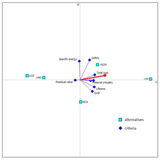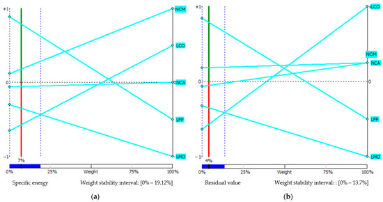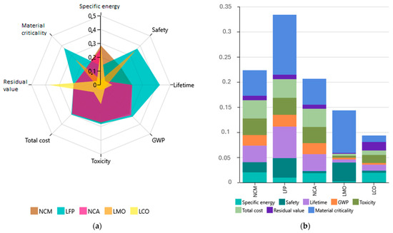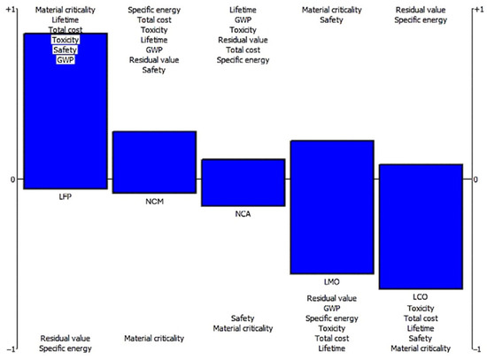 Figure 7a shows the attributes of the alternatives before incorporating the weights of the criteria. LFP outperforms the rest in lifetime, safety, material criticality, and environmental performance. On the other hand, NCM and NCA appear to have inferior specific energy and an overall good environmental performance and low cost. Their high specific energy and adequately good lifetime drastically lower the required mass of battery and replacement rate, respectively. LCO has a high residual value due to its increased content in cobalt, which results in considerable environmental damage and total cost. Lastly, LMO has the lowest specific energy and lifetime, and poor performance in almost all criteria.
