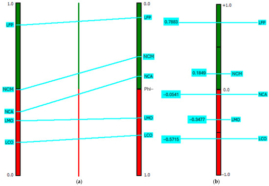 A visual representation of the flow scores is provided in Figure 8. Figure 8a represents the partial ranking of the alternatives based on PROMETHEE I and the positive and negative flow scores. Figure 8b illustrates the complete ranking of the alternatives based on PROMETHEE II, which combines the positive and negative flow scores into a single net flow score. LFP has the highest ranking, achieving a net flow score of 0.7883 among all other alternatives. Far below is the NCM battery scoring 0.1849, followed by the NCA technology. It is worth noting that NCA has a negative net flow score, which according to PROMETHEE indicates an undesirable option. Similarly to the results of the AHP method, LMO and LCO scored at the bottom of the ranking.