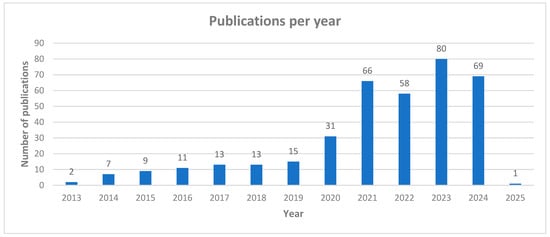Table 1 provides the main information about the data. Even though the search was limited to publications between 2010 and 2024, it was noted that the first publication was in 2013, indicating that this is a young field. The average citations per publication is high (17.3), highlighting the research’s significant impact and relevance.