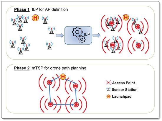 The proliferation of wireless sensor networks in remote and inaccessible areas demands efficient data collection approaches that minimize energy consumption while ensuring comprehensive coverage. Traditional data retrieval methods face significant challenges when sensors are sparsely distributed across extensive areas, particularly in scenarios where direct sensor access is impractical due to terrain constraints or operational limitations. This research addresses these challenges through a novel hybrid optimization framework that combines integer linear programming (ILP) with multiple traveling salesperson problem (mTSP) algorithms for drone-based data collection in wireless sensor networks (WSNs). The methodology employs a two-phase approach, where ILP optimally determines strategic access point locations for sensor clustering based on communication capabilities, followed by mTSP optimization to generate efficient inter-AP flight trajectories rather than individual sensor visits. Comprehensive simulations across diverse network configurations and drone quantities demonstrate consistent performance improvements, with travel distance reductions reaching 32% compared to conventional mTSP implementations. Comparative evaluation against established clustering algorithms including Voronoi, DBSCAN, Constrained K-Means, Graph-Based clustering, and Greedy Circle Packing confirms that ILP consistently achieves optimal access point allocation while maintaining superior routing efficiency. Additionally, a novel quality assessment metric quantifies sensor grouping effectiveness, revealing that ILP-based clustering advantages become increasingly pronounced with higher sensor densities, providing substantial operational benefits for large-scale wireless sensor network deployments. Full article