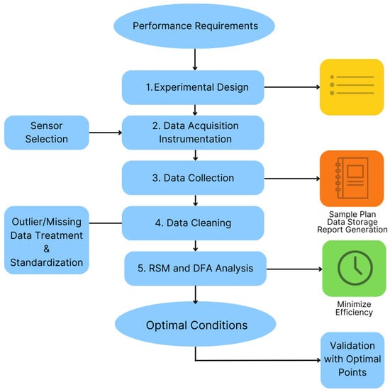 Methodological workflow of the study. The process begins with defining performance requirements, followed by sensor selection and system integration. Experimental validation is then conducted through data acquisition and cleaning. The final stages involve optimization using Response Surface Methodology (RSM) and validation of optimal points with the Desirability Function Approach (DFA).