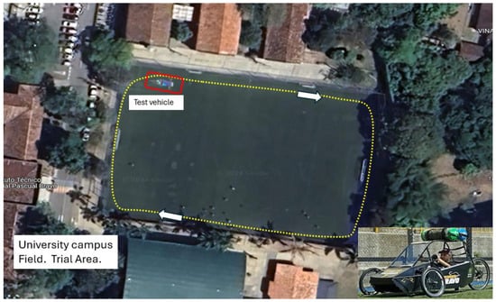 The trials were conducted on a synthetic grass field measuring 52 m by 30 m. The circuit was delineated within a 3 m wide lane positioned between the perimeter fence and the inner side of the field, and orange safety cones were used to provide guidance and ensure safety. To minimize environmental variability, all tests were carried out within a fixed time window between 12:00 and 12:30 p.m. Thus, all trials were performed on a synthetic-turf track under controlled conditions. This surface was selected to reduce the influence of wind disturbance and surface irregularities, thereby improving consistency in data collection. It is nevertheless acknowledged that alternative track surfaces, such as asphalt, may alter vehicle dynamics and the energy performance index (km/Ah). For this reason, further validation on different terrains is recommended to broaden the external validity of the findings.