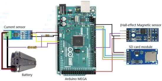 Several sensors and electronic components were integrated into the project, including the Arduino MEGA 2560 microcontroller, the ACS712 current sensor, the A3144 magnetic Hall effect sensor, LEDs, resistors, and a soldered breadboard. The car battery was connected to the Arduino via a current sensor and a voltage divider, while a Hall effect magnetic sensor was also attached to measure speed. An SD card module was also employed for data logging. The overall configuration of these elements is shown in Figure 4.