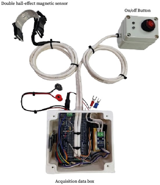The acquisition and recording of data were carried out using a system specifically designed to withstand multiple tests and variable weather conditions. Two Hall effect sensors were mounted on a horseshoe-type support attached to one of the front tires. An on/off system was implemented to control the acquisition device, while a protective enclosure was used to isolate the Arduino and the current sensor from external elements. To prevent additional energy consumption that could affect the system’s efficiency, the device and sensors were powered independently by a 9 V battery.