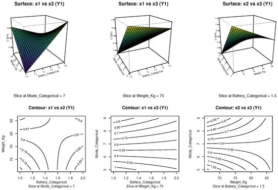 The composite desirability optimization reinforced this convergence, identifying the best compromise solution at (Battery = 1.0), (Weight = 66 kg), and (Mode = N5). Under these conditions, the predicted responses were 1.121 h for , 23.71 km for , and 2.90 km/Ah for , with an overall desirability score of 0.945. This result confirmed the suitability of lightweight and low-power configurations as the most effective balance between endurance, range, and energy performance.