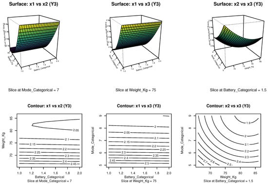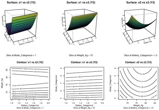 The selection of the first-order model with two-way interaction (FO + TWI) for operational time and the first-order model with principal and quadratic effects (FO + PQ) for distance and efficiency was made to balance statistical accuracy with interpretability and numerical stability. Although full second-order models offered slightly higher unadjusted values, issues such as coefficient aliasing were encountered, which limited their reliability for canonical analysis and optimization. The chosen specifications therefore provided a more robust analytical framework, allowing the visualization of response surfaces and delivering clear insights into the optimal operating conditions of the electric vehicle.