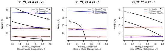 Superimposed contour plots for the response variables (operational time), (travel distance), and (energy performance), at three fixed levels of power mode . Source: Author’s own elaboration.