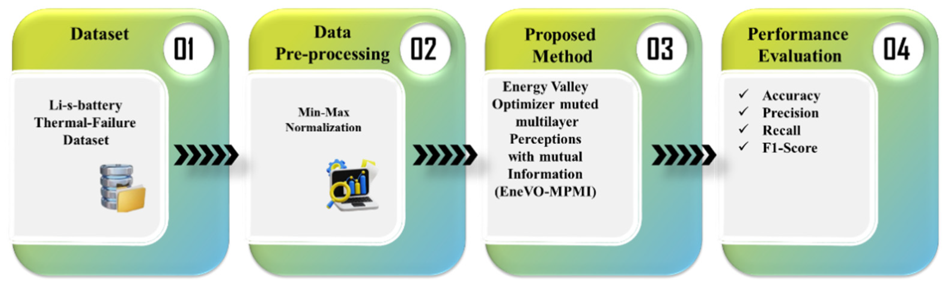 To ensure the early thermal failure prediction of lithium–sulfur batteries, this approach leverages sensor-driven temperature data simulated with varied operational conditions. The data are preprocessed with min–max normalization to provide consistent input scaling. The model, EneVO-MPMI, combining Energy Valley Optimizer, Multilayer Perceptrons, and Mutual Information, is trained and validated with five-fold cross-validation, providing accurate, efficient, and consistent failure predictions. The overall flow for the prediction methods of lithium–sulfur batteries is shown in