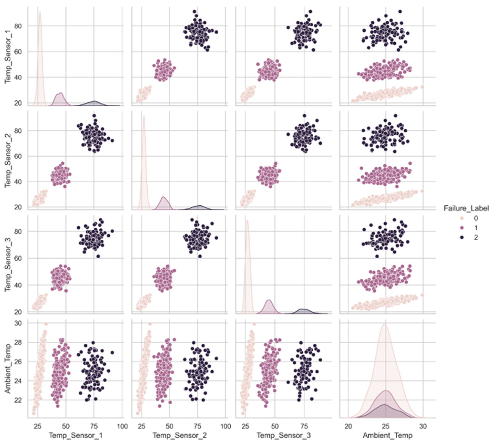 To facilitate thermal failure prediction and battery safety improvement using machine learning approaches, the dataset provides sensor-based thermal data for lithium–sulfur (Li-S) battery modules. It replicates temperature data from several sensors on several Li-S battery modules, including labeled failure status, charge and discharge rates, and ambient temperature. The objective is to lower the danger of thermal escalation in Li-S batteries by enabling intelligent systems for the early identification of thermal abnormalities. As concerns the sample data, a pair plot is used to show how the sensor and ambient temperatures relate to each other and to help separate normal and failure conditions visually; this is shown in