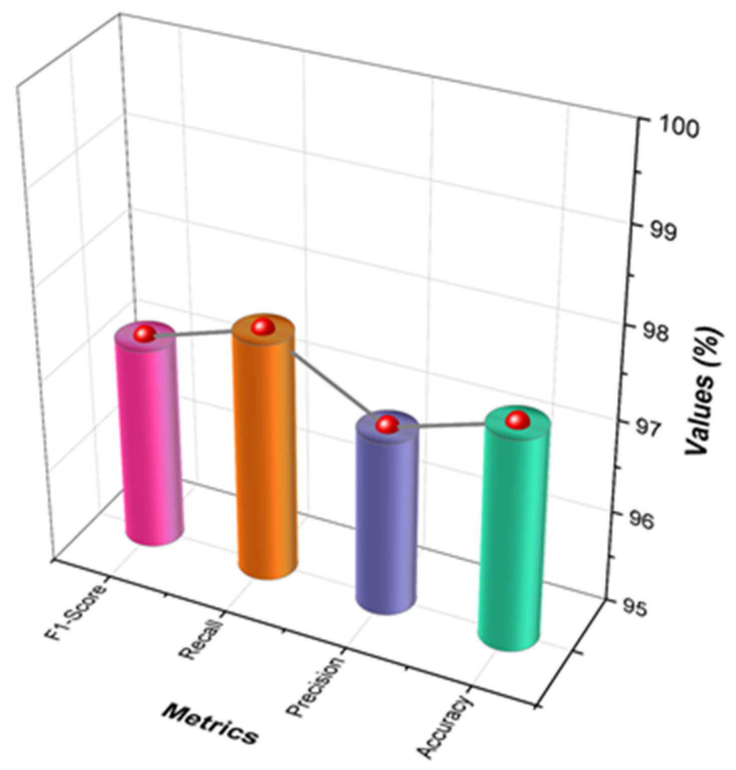 22]) reduces its F1-score from 97.2% to 94.8% (2.4%) and “overheat alert” recall from 97.6% to 93.5% (4.1%). The MI module filters redundancy but cannot distinguish true thermal trends from noise, unlike Random Forest [