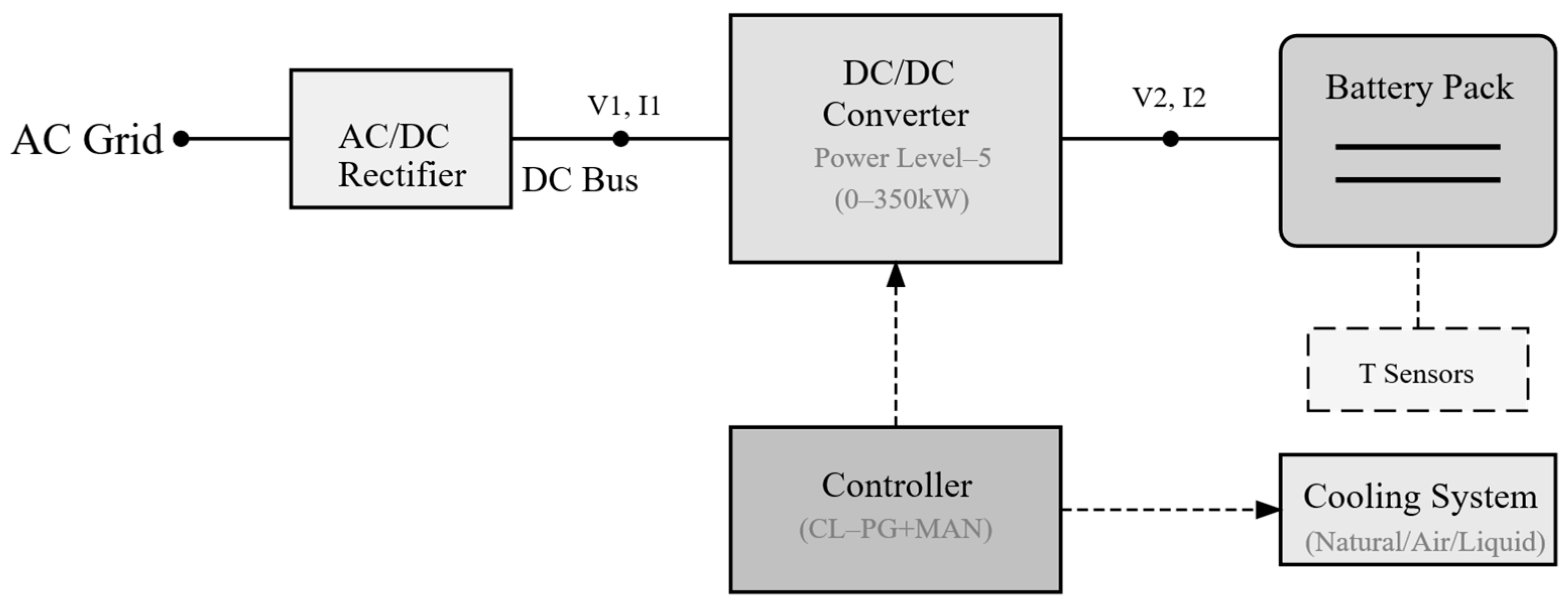 Figure 2 illustrates the charging system circuit diagram, showing the power conversion stages from AC grid to battery pack, with the proposed CL-PG+MAN controller managing both charging power and cooling system operation.