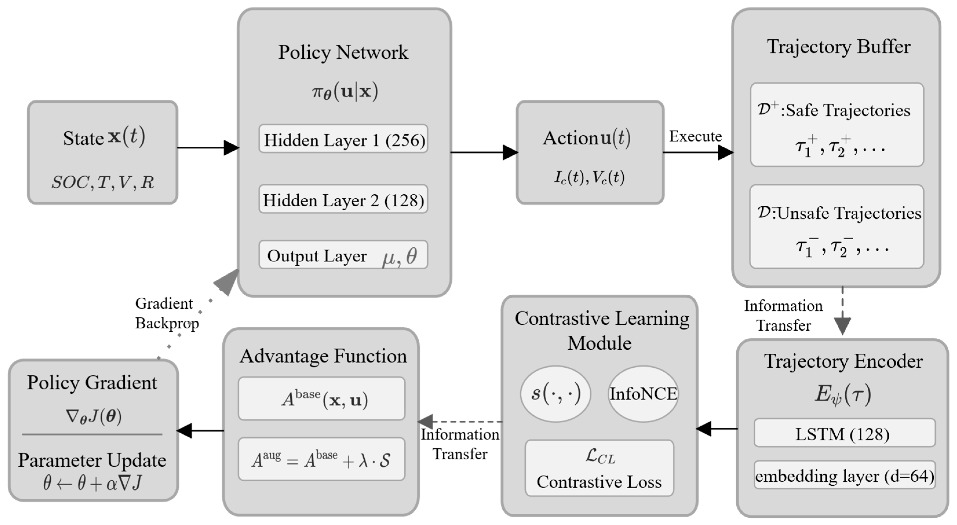 A contrastive learning–enhanced policy gradient (CLPG) algorithm is designed to improve policy learning efficiency by incorporating a novel trajectory-level contrastive learning mechanism that distinguishes between safe/efficient and unsafe/inefficient charging patterns.