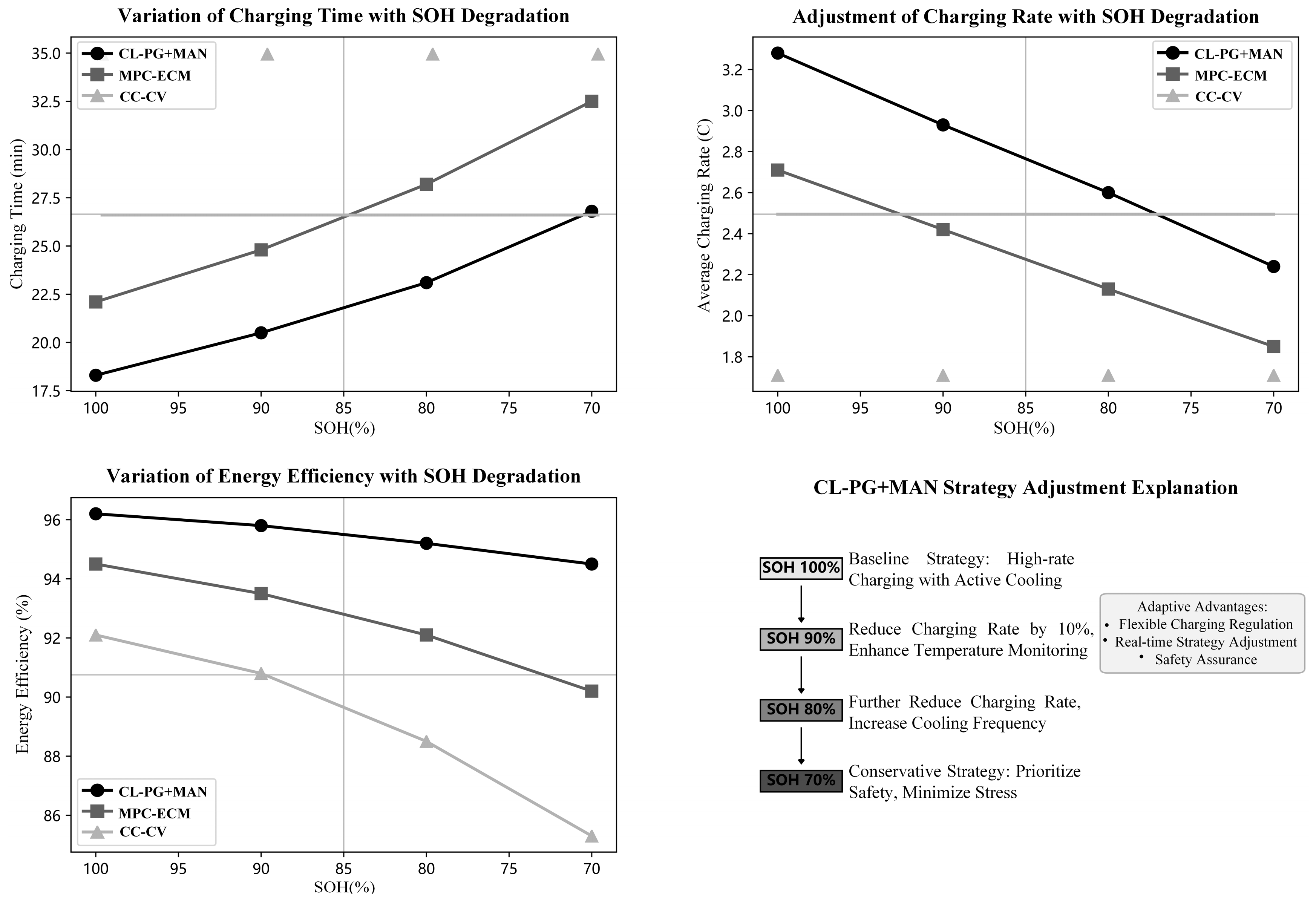 SOH (%) | Algorithm | Charging Time (min) | Avg. C-Rate | Energy Efficiency (%) | Max Temp Rise (°C) | Strategy Adaptation Description |