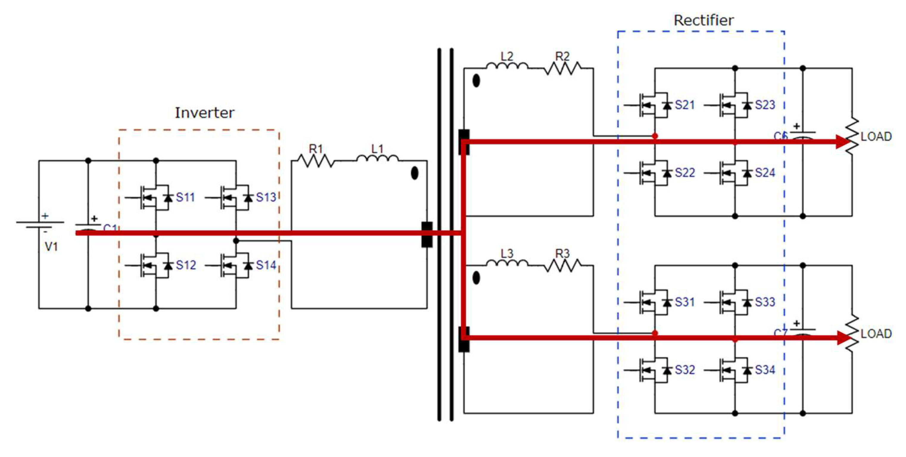 into a high-frequency alternating signal, which is transmitted to the high-frequency transformer positioned at the center of the diagram. This transformer comprises three windings facilitating energy distribution to the two rectifiers. Each rectifier, positioned on the right side of the figure, contains an H-bridge (