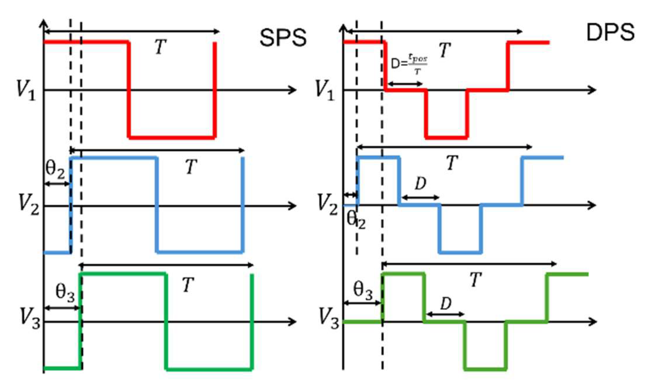 Figure 3 illustrates a comparison between the two modulation methods used in this article, the Single-Phase Shift (SPS) and the Dual-Phase Shift (DPS). In the SPS, the signals