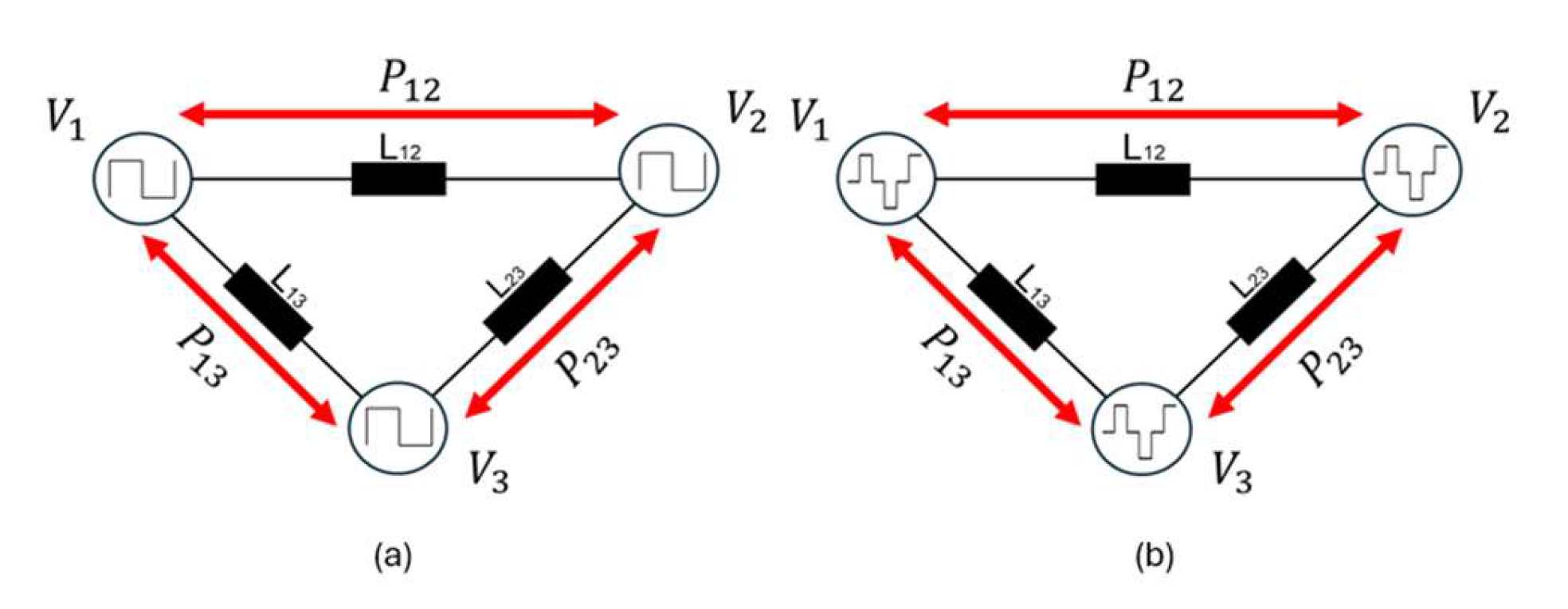 These differential equations facilitate the simulation of the current dynamics in each inductance based on the voltage differentials between nodes. This model accurately demonstrates how the system operates under SPS or DPS phase modulation techniques. Specifically, these techniques alter the phase differences between nodes, subsequently impacting the currents in each inductance.