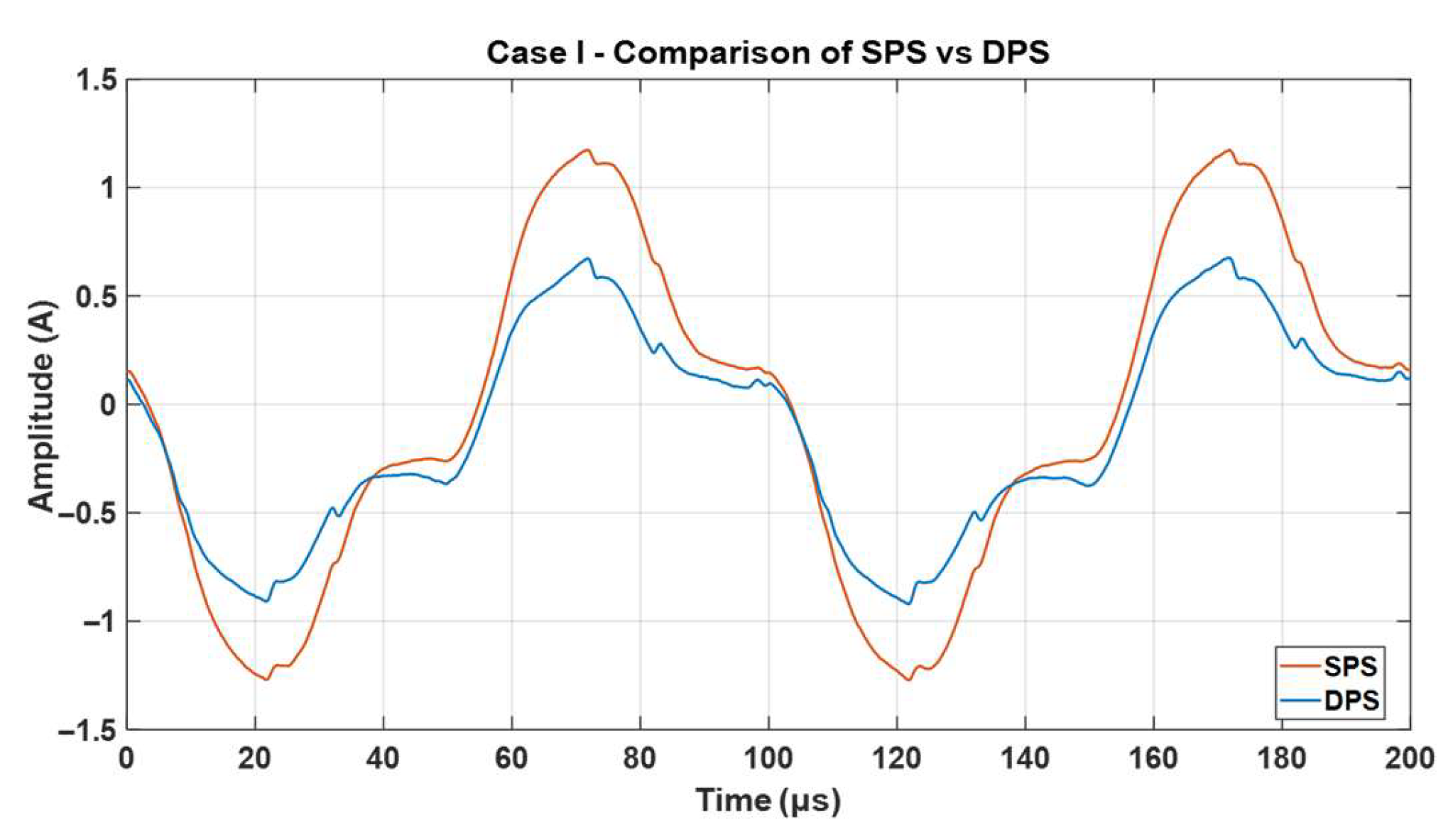 Figure 8 compares the input current waveforms under SPS and DPS modulation. The SPS current shows sharper transitions and higher peaks, while the DPS waveform appears smoother and with reduced distortion. This qualitative observation suggests that DPS reduces harmonic content and improves current quality.