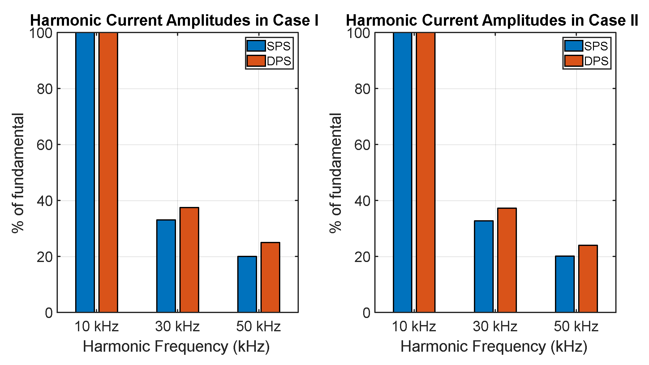Figure 9, where DPS exhibits lower harmonic current amplitudes and higher efficiency in both operating configurations. The reduced distortion achieved by DPS contributes to a decrease in power losses, which translates into improved overall system efficiency. Specifically, in Case II, DPS achieves an efficiency of 87%, outperforming SPS in both study cases.