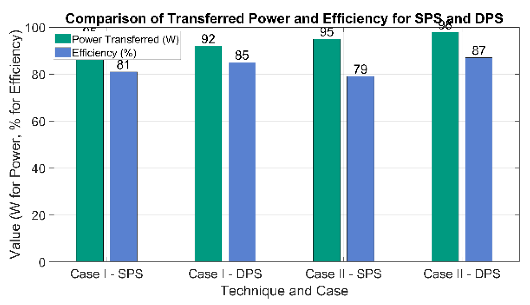 Additionally, the comparison of transferred power between the modulation techniques shows that DPS enables higher power transfer, reaching values up to 95 W in Case II. This behavior suggests that DPS is more suitable for applications requiring precise and adaptable power regulation, such as renewable energy systems, smart grids, and electric vehicles.