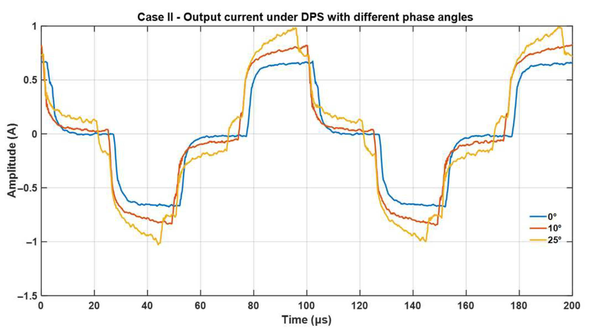 Figure 11 presents the output current waveforms obtained under DPS modulation with different intra-bridge phase angles (0°, 10°, and 25°). As the phase angle increases, the current profile becomes more distorted and peak values rise, highlighting the trade-off between controllability and harmonic distortion. In particular, 0° is equivalent to the SPS condition, whereas larger angles values correspond to full DPS operation.