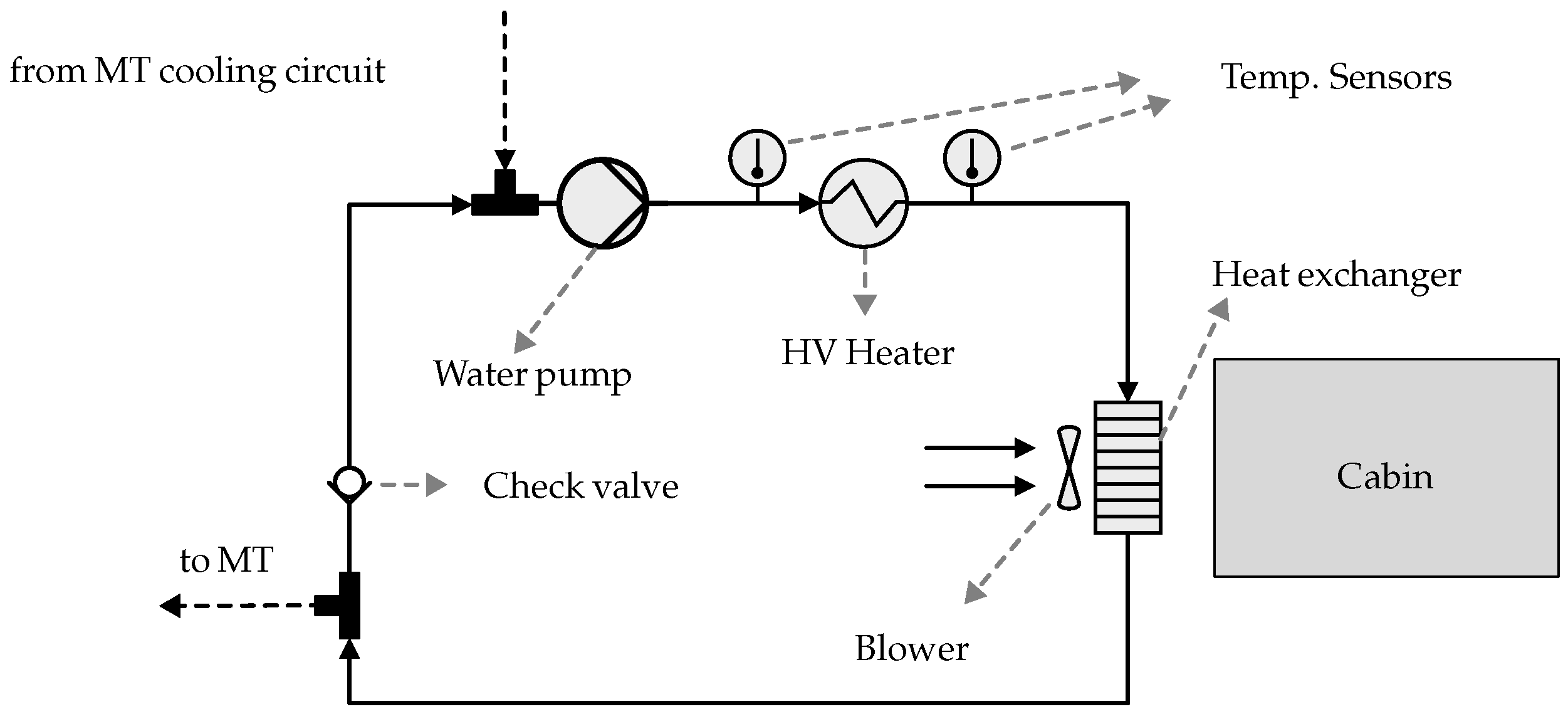 The working fluid, hereafter referred to as the coolant, is a mixture of 50% water and 50% ethylene glycol. The heater is equipped with sensors that measure the inlet and outlet coolant temperatures. The dashed lines and T-connectors indicate the possibility of coupling the heating circuit with the medium-temperature (MT) cooling circuit, enabling the use of waste heat for cabin heating, as demonstrated in previous PEM research [