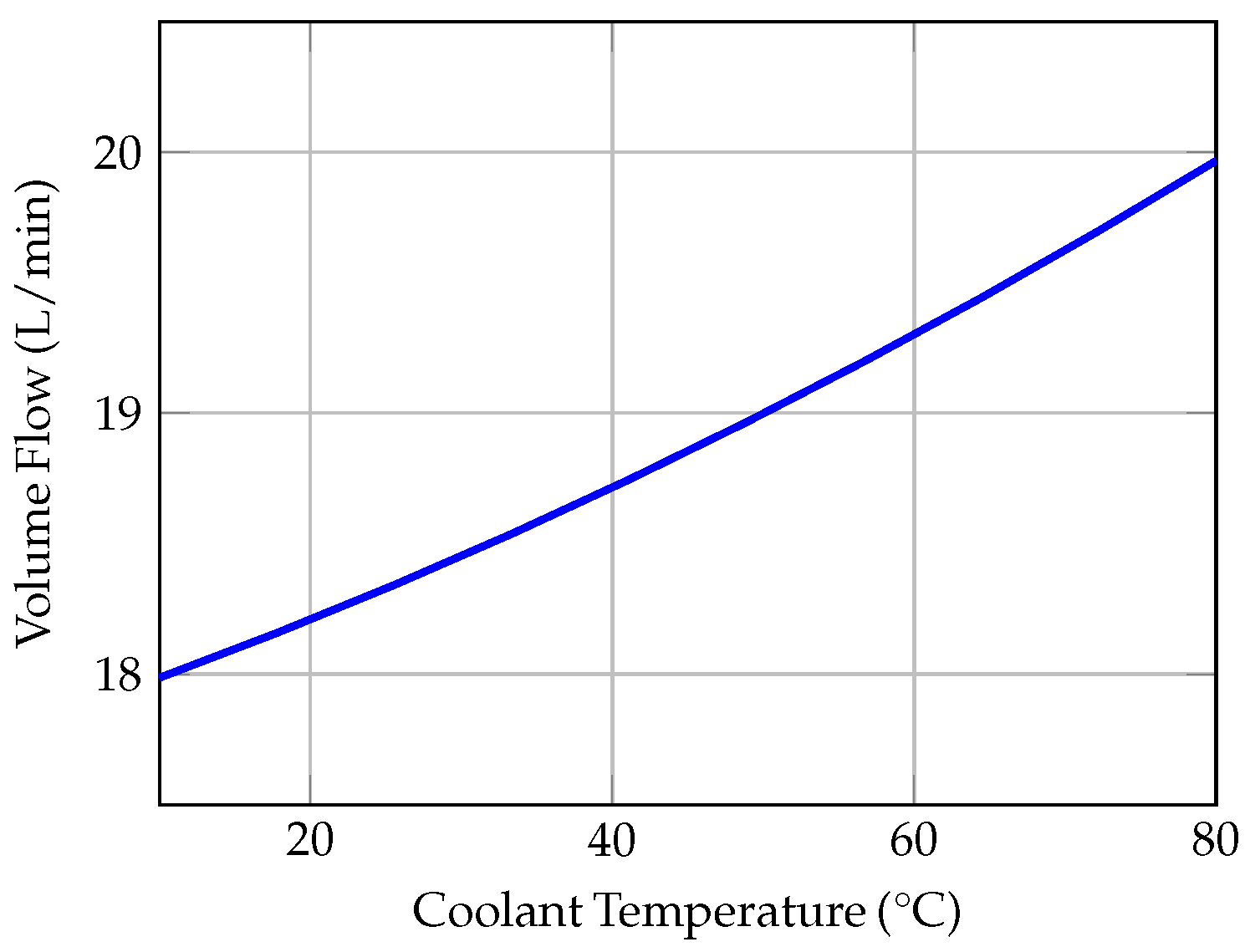 ), the pump is operated at maximum speed whenever it is switched on. Consequently, variations in the flow rate are primarily caused by temperature-dependent changes in viscosity. The coolant flow rate is therefore determined experimentally using an ultrasonic volume flow sensor. As the sensor measures volume flow, the temperature-dependent relationship between volume flow and mass flow is incorporated into the model by accounting for the coolant density as a function of temperature. The experimentally determined volume flow and its dependence on temperature are shown in